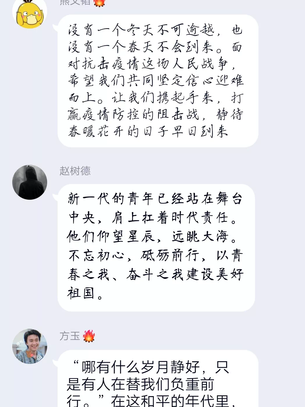 随着直播的进行,各班级群讨论也越发激烈,19级食品工程升本班的刘成洁同学看完直播后说:“社会飞速发展,青年人要自醒、自悟,更需要努力奋发,这样我们才能紧跟形势,在市场经济大潮起潮流中造就出无愧于民族、无愧于时代的中华英才。”18级生物制药班顾寒雪说:“通过这次的主题学习,我们看到了国家各个职业的劳动人民在疫情面前的贡献以及必胜的决心,充分展现了广大团员青年不惧风雨、勇担重任的精神风貌。在那些投身抗疫的青年身上,看到了青春与热血。”17级食工班同学说:昔日祖国的花朵,如今已经成长为国家的栋梁之才,成为抗击疫情的主力军。