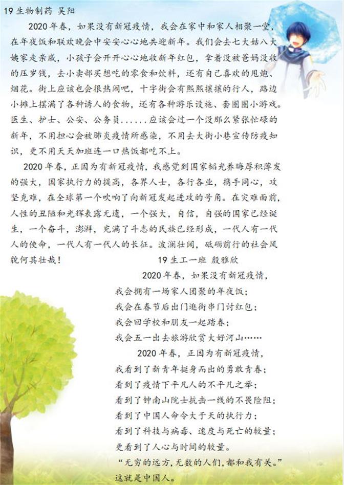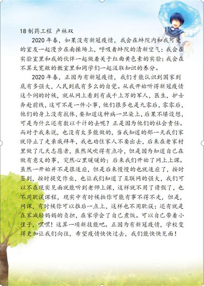 本次活动,依托网络,同学们以“2020年春,如果没有新冠疫情,我会在…。2020年春,正因为有新冠疫情,我……”进行造句,写一段疫情期间的感悟。同学们积极参与此次活动在评委们公平公正的原则下,最终卢林双获得一等奖,吴阳、刘梦获得二等奖,武文婕、徐彩霞、殷雅欣获得三等奖,周霞亮等6名同学获得优秀奖。