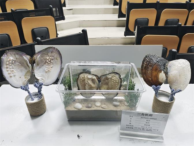 根据疫情防控的要求,此次比赛为线上评审,决赛阶段分为全方位作品视频展示与作品说明书评审、线上答辩评审两个环节。参赛团队通过制作视频全方位展示作品概况,答辩环节从设计理念、制作过程、制作方法、作品创新等方面进行陈述。选送的动物组作品“三角帆蚌(Hyriopsis cumingii)”经过激烈的比拼荣获省赛三等奖。该作品通过三个部分展示三角帆蚌标本,分别为生长有珍珠的浸制标本部分,显示珍珠层的蚌壳标本部分和展示珍珠的蚌壳标本部分,最终实现珍珠蚌的完整与局部的共同呈现。