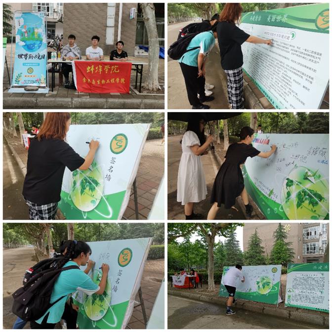 现场宣传及签名。6月5日,在图书馆前进行了摆台宣传活动,活动现场,通过悬挂宣传横幅、展板等方式,展示同学们精心设计的“6.5世界环境日”宣传海报并通过集体签名的方式向师生们传递绿色文明。活动工作人员向大家介绍六五世界环境日的主题背景及环境保护的重要意义,宣传生态环境保护和“碳达峰”、“碳中和”等相关知识,同时对一些日常简单易行的低碳生活方式和环保小窍门进行细致讲解。