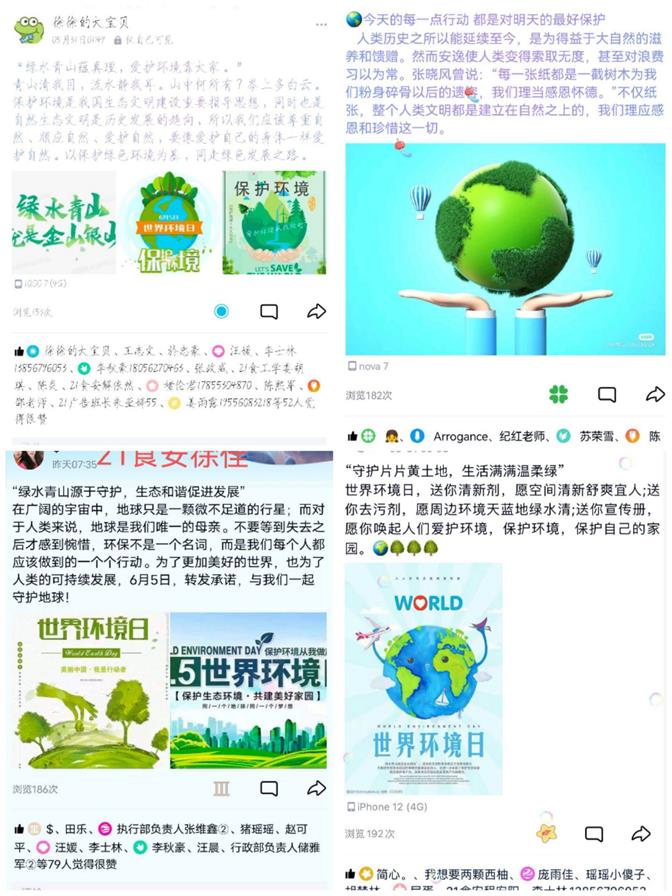 环境日宣传口号征集。活动要求参赛者结合今年世界环境日的主题“共建清洁美丽世界”,充分发挥自己的才能,在朋友圈发表保护环境的宣传口号。活动征集的口号有:“绿色环保记于心,绿水青山协同行”、“今天的每一点行动,都是对明天的最好保护”、等等。参赛同学纷纷表示:“环境是大家共同生存的地方,也是需要我们共同保护的对象。保护环境,人人有责,保护环境,从身边点点滴滴做起。”