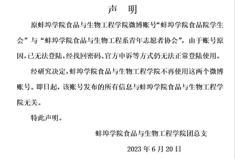 关于太阳集团网站8722团总支学生会微博账号停用的声明