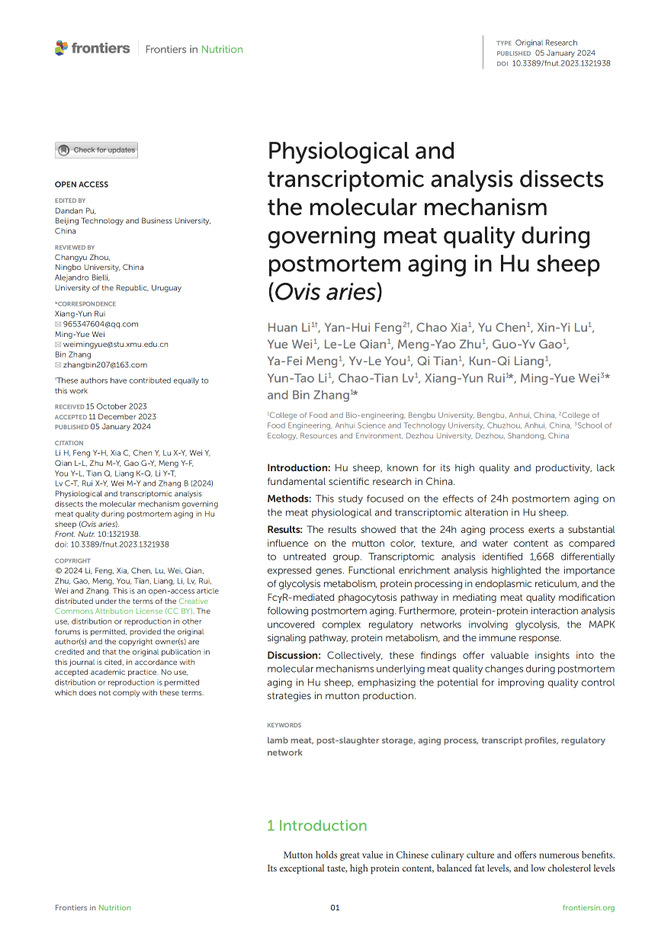 近日,我院畜禽肉制品绿色加工团队在国际著名期刊《Frontiers in Nutrition》(中科院SCI二区,影响因子5.0)在线发表了题为“Physiological and transcriptomic analysis dissects the molecular mechanism governing meat quality during postmortem aging in Hu sheep (Ovis aries)”的研究论文。