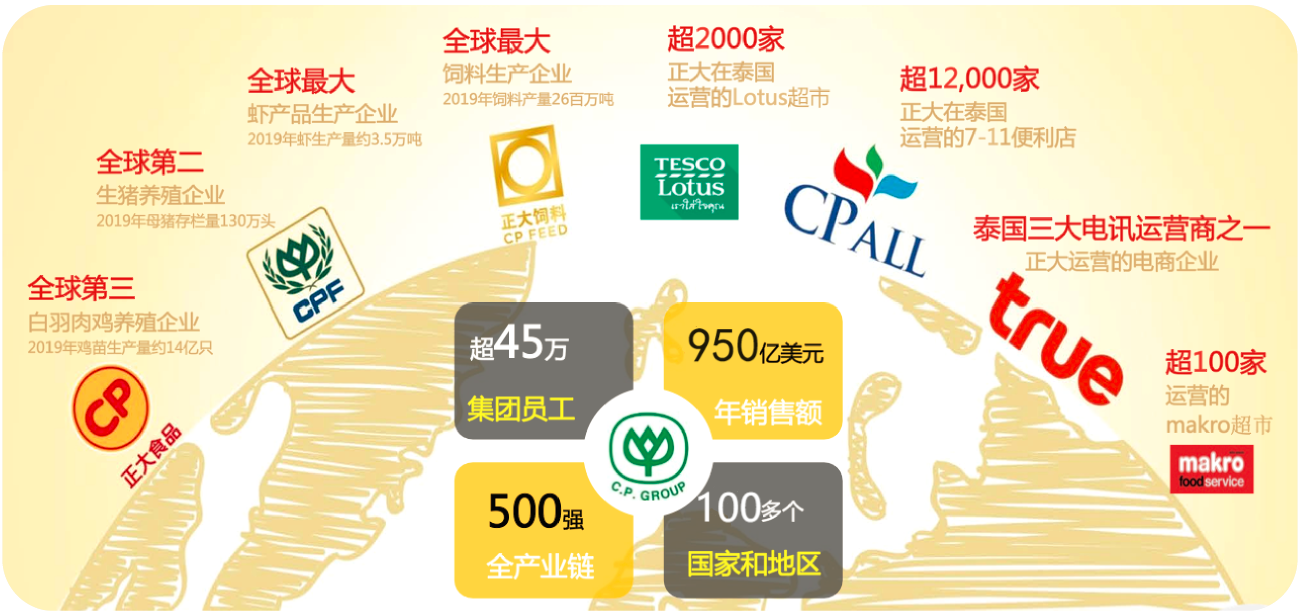 正大集团1921年成立,是世界知名企业,集团1979年进入中国,是改革开放后第一家进入中国大陆的外资企业。集团坚持“利国、利民、利企业”经营宗旨,以“做世界的厨房,人类能源的供应者”为集团愿景,经过100多年发展,由单一“种子行”发展成以农牧食品、批发零售、电信电视三大事业为核心,同时涉及众多行业和领域的多元化跨国企业集团。