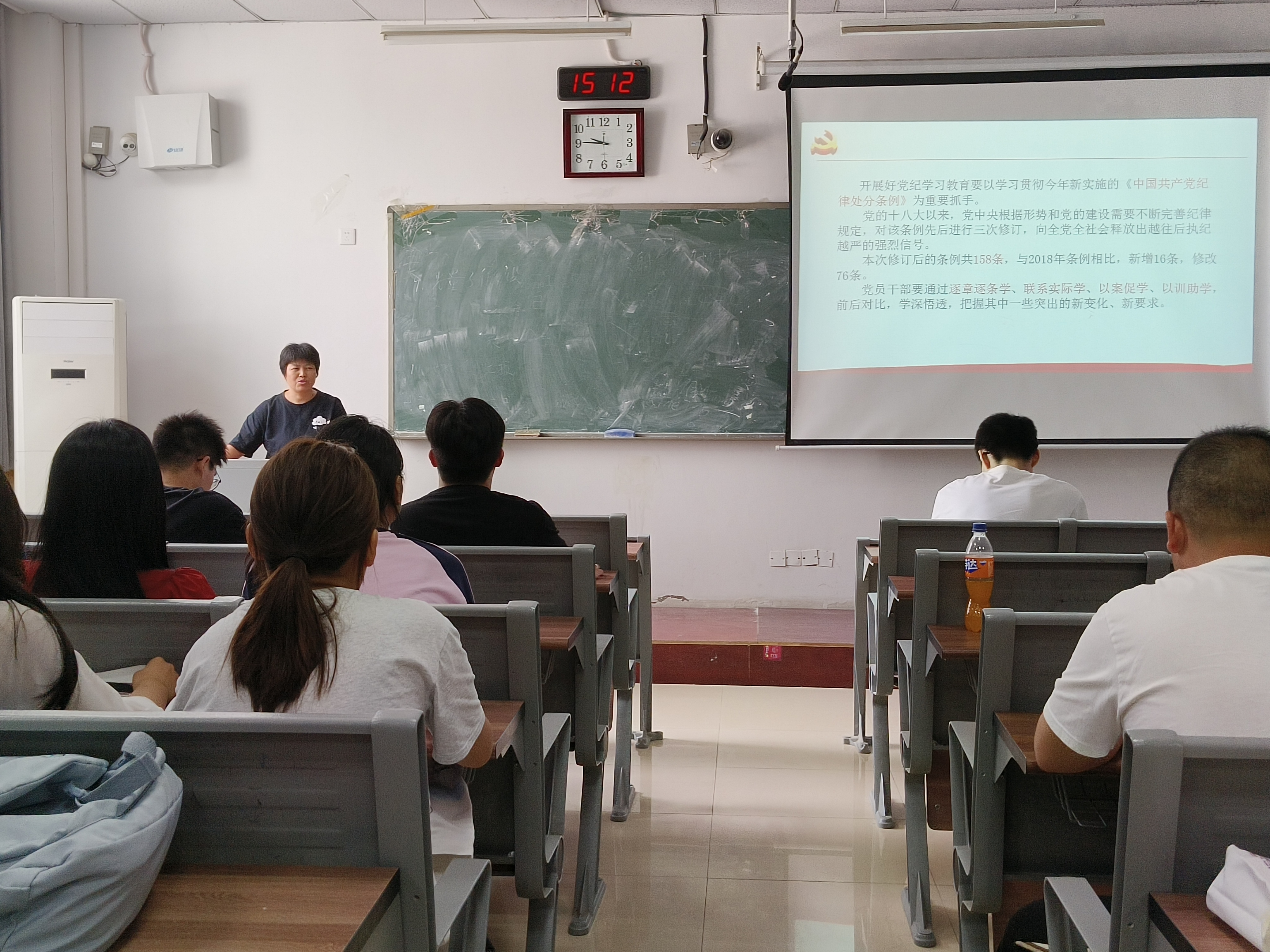 为加强学生党员的纪律意识,提升党性修养,6月25日,太阳集团网站8722食品工程学生党支部开展了一场重要的党纪学习教育党课,支部书记闫利萍主讲,主题是《中国共产党纪律处分条例》的六大纪律,全体党员参加。