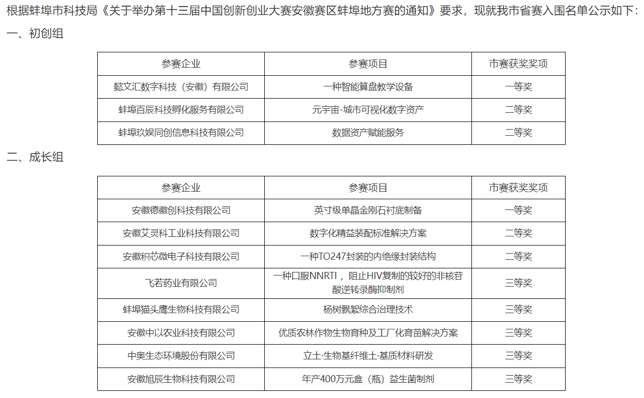 8月7日,第十三届中国创新创业大赛安徽赛区蚌埠地方赛成功举办。本次赛事由蚌埠市科技局主办、蚌埠市创新馆承办,吸引了全市40余家创新型企业和团队报名参赛。大赛分为初创企业组和成长企业组,参赛企业涵盖新一代信息技术、高端装备制造、生物医药、新材料、节能环保等7个战略性新兴产业领域。经过激烈角逐,11个项目将代表蚌埠参加省决赛。tyc8722太阳集团与中奥生态环境股份有限公司的合作项目“立土·生物基纤维土·基质材料研发”荣获三等奖,成功入围安徽省决赛。