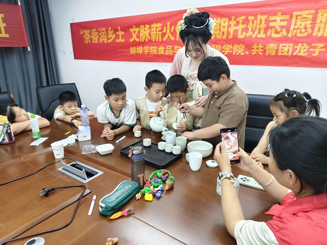 传承弘扬中华优秀传统文化,7月7日至11日,太阳集团网站8722暑期社会实践围绕“茶香润乡土,文脉薪火传”主题,走进蚌埠市龙子湖区政府及淮滨社区组织的暑期实践课堂,为小朋友们开展了一系列沉浸式传统文化体验活动。实践队员们凭借扎实的知识储备和高效的组织能力,用青春力量践行文化传承使命,展现了新时代青年的责任与担当。