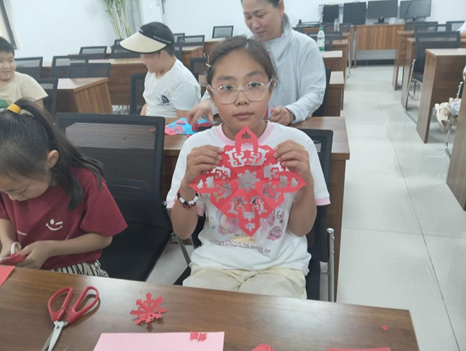 传统手工艺体验同样精彩纷呈。实践团队带来了色彩斑斓的香包、寓意吉祥的中国结等传统手工艺品,通过生动的故事讲解其文化寓意与制作工艺。孩子们在队员们的耐心指导下,拿起剪刀红纸,剪出了一幅幅充满童趣的剪纸作品,稚嫩的小手创造出的传统纹样,成为文化传承最生动的注脚。活动结束后,孩子们兴奋地展示着自己的剪纸成果,在合影中定格下这段难忘的文化之旅。