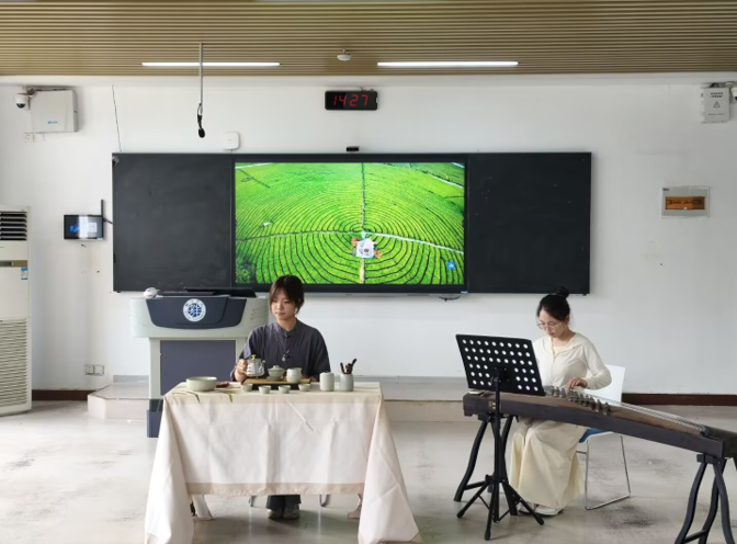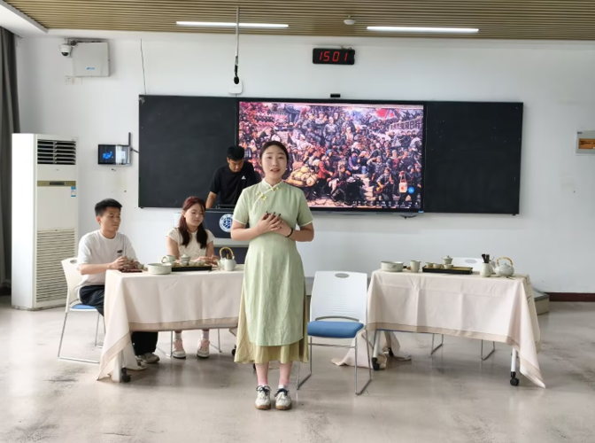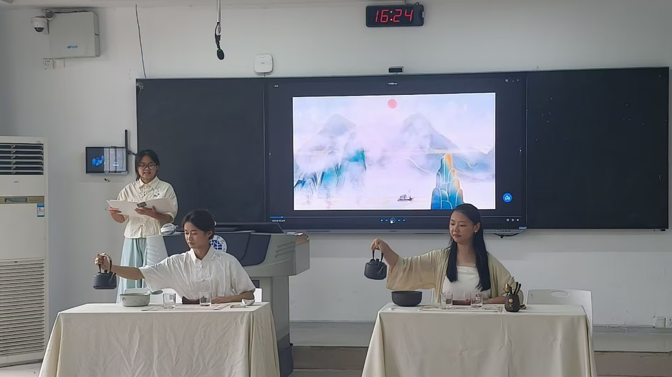 比赛现场茶香氤氲、氛围热烈。全校11支参赛团队近50名学生身着传统服饰,依次展现茶艺魅力:温杯洁具、投茶注水、闻香品茗、奉茶谢客,每一环皆彰显茶文化深厚底蕴,为观众献上视觉与味觉的双重盛宴。