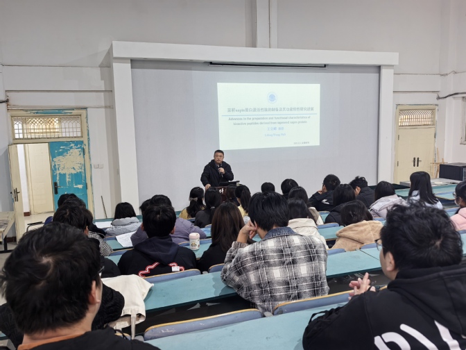 王立峰教授以《菜籽napin 蛋白源活性肽的制备及其功能特性研究进展》为题作专题汇报。王教授系统解析了菜籽蛋白及菜籽蛋白活性肽的核心功能与制备关键技术,深入阐释其在小肠内的吸收机制与降解路径,同时围绕活性肽应用安全性展开专业探讨,分享了功能食品研发领域的前沿理论成果与实践经验。现场师生结合专业所学积极互动提问,与教授就技术瓶颈突破、产业应用前景等关键问题展开深度思辨交流。